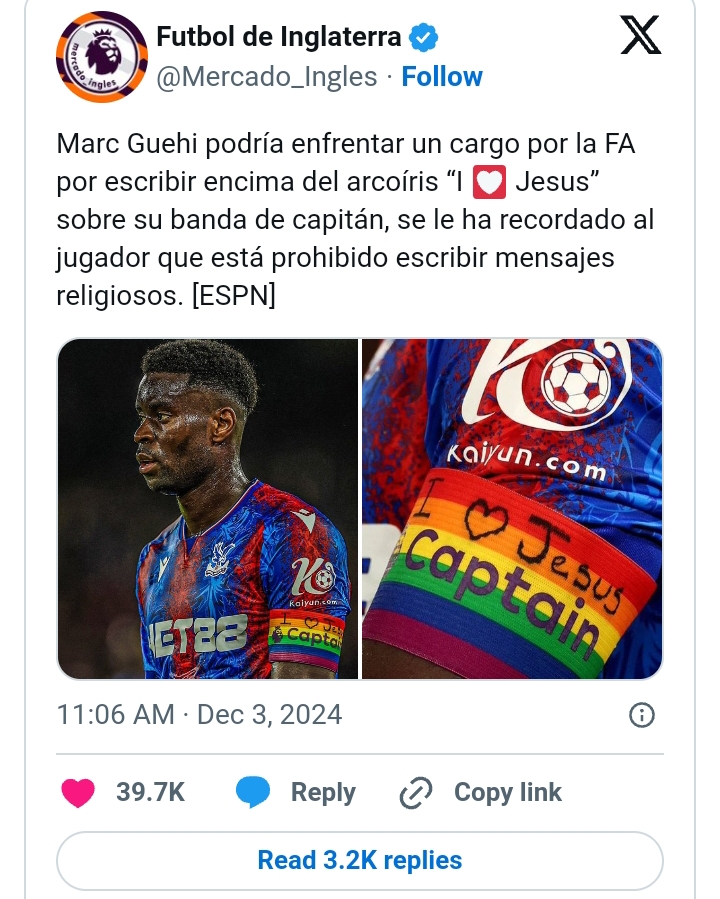Por otra parte, el capitán del Crystal Palace, Marc Guehi fue advertido por la Federación Inglesa por escribir en la cinta “Amo a Jesús”, lo cual está prohibido ya que no pueden escribir mensajes religiosos.