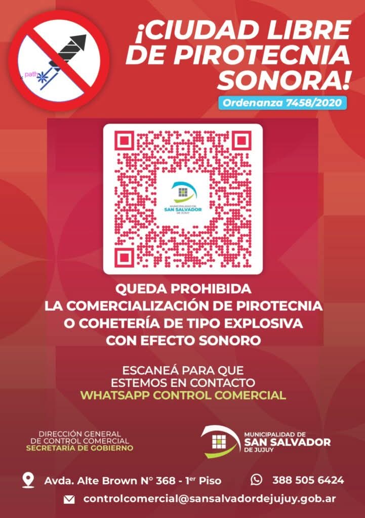 En este contexto, se realizan controles permanentes para garantizar el cumplimiento de la ordenanza, a cargo de personal municipal de la Dirección General de Control Comercial, dependiente de la Secretaría de Gobierno. Ante cualquier consulta o denuncia vinculada a la venta de pirotecnia sonora, los vecinos pueden comunicarse a través del WhatsApp de Control Comercial, disponible mediante el código QR oficial o al número 388 505 6424.