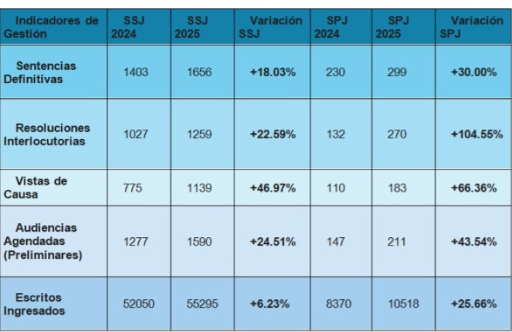 En el Centro Judicial San Pedro de Jujuy, los datos comparativos del año 2024 con 2025 muestran también un importante avance en productividad, al establecer que el dictado de sentencias definitivas tuvo un crecimiento del 30 %, pasando de 230 a 299 durante el último año.