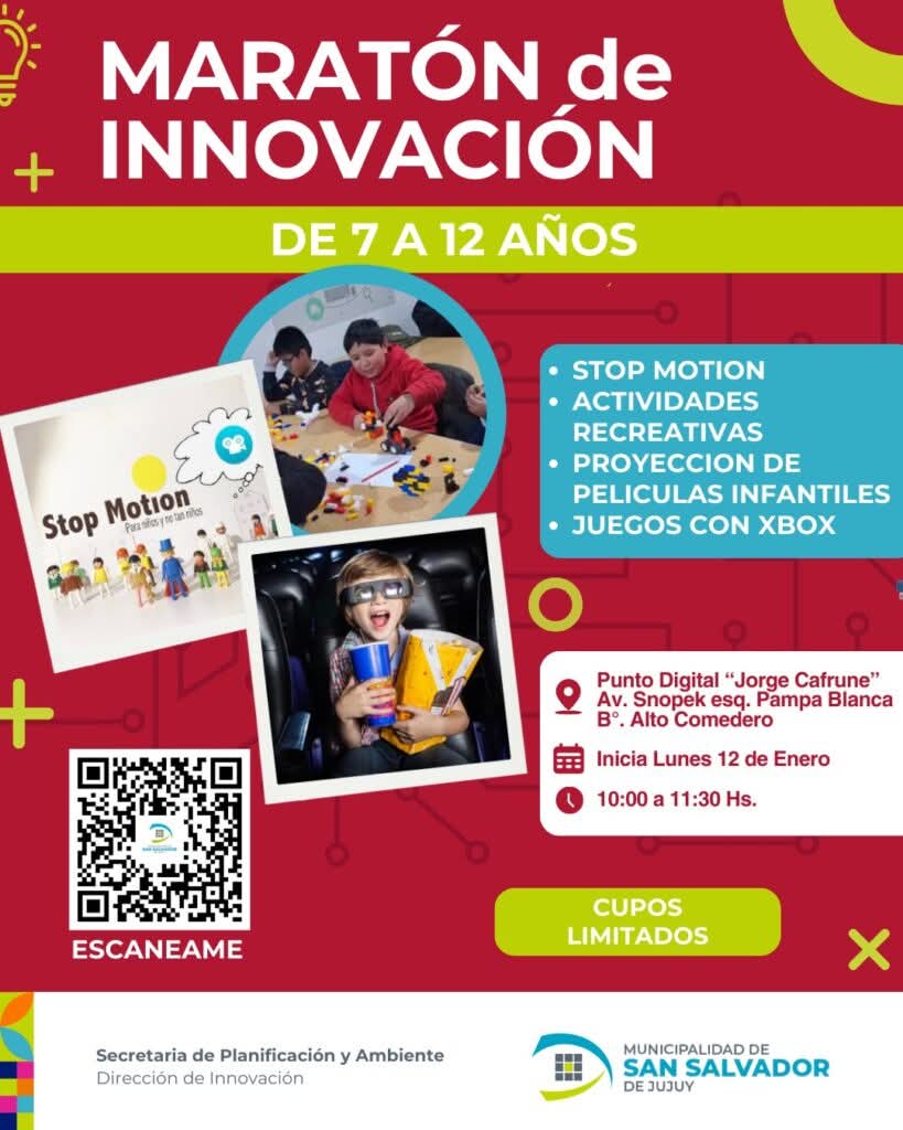 La Municipalidad de San Salvador de Jujuy, a través de la Secretaría de Planificación y Ambiente y su Dirección de Innovación, lanza una nueva edición de la Maratón de Innovación destinada a niños y niñas de entre 7 y 12 años. Las actividades comenzarán el lunes 12 de enero, en el Punto Digital “Jorge Cafrune” de Alto Comedero de 10 a 11:30 horas. Los cupos son limitados, por lo que se recomienda a las familias inscribirse con anticipación.