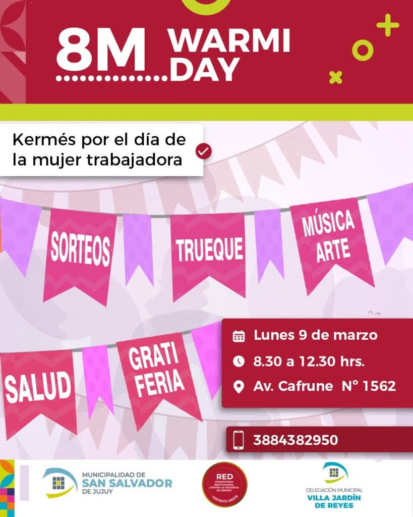 En el marco de las actividades por el Día Internacional de la Mujer Trabajadora, la Municipalidad de San Salvador de Jujuy invita a participar del “8M Warmi Day – Kermés por el Día de la Mujer Trabajadora”, una jornada abierta a todas las mujeres que combinará espacios de encuentro, cultura, salud y recreación.