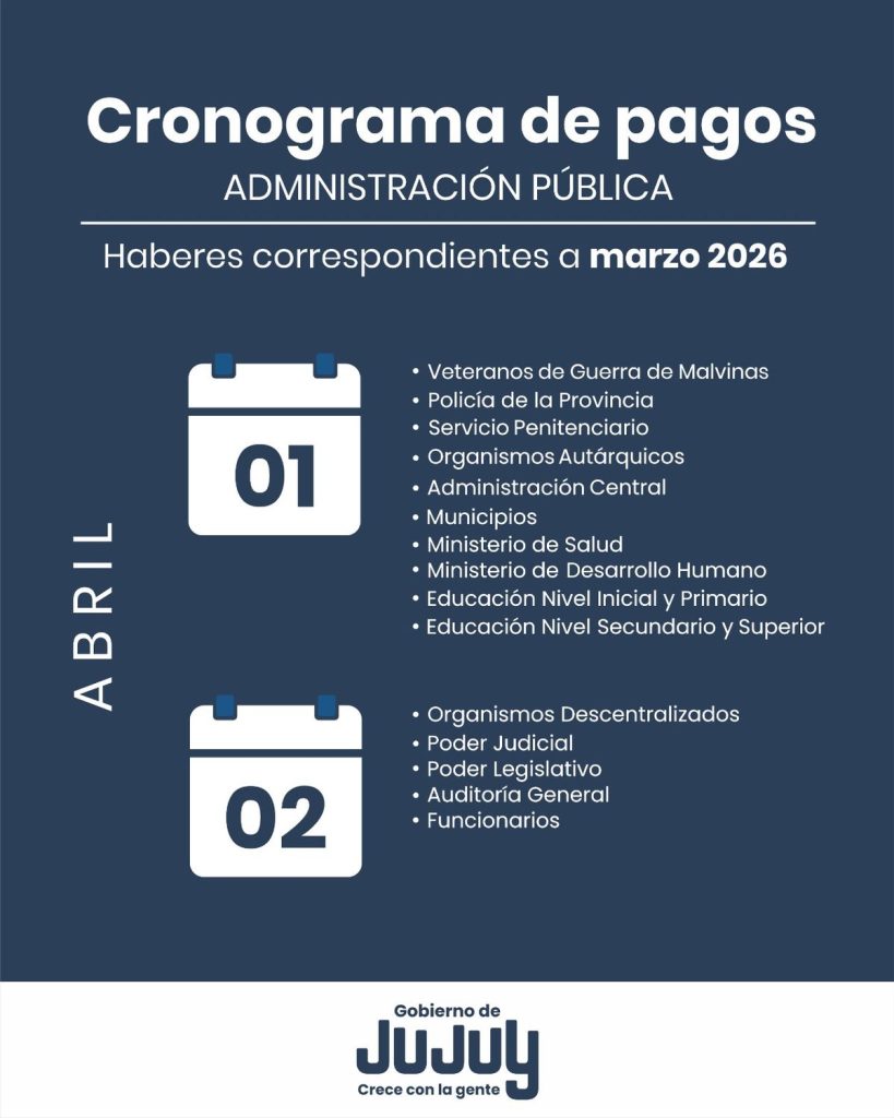 La Tesorería de la Provincia de Jujuy informó que la acreditación de los salarios a los trabajadores de la administración pública provincial tendrá lugar los días miércoles 1 y jueves 2 de abril.